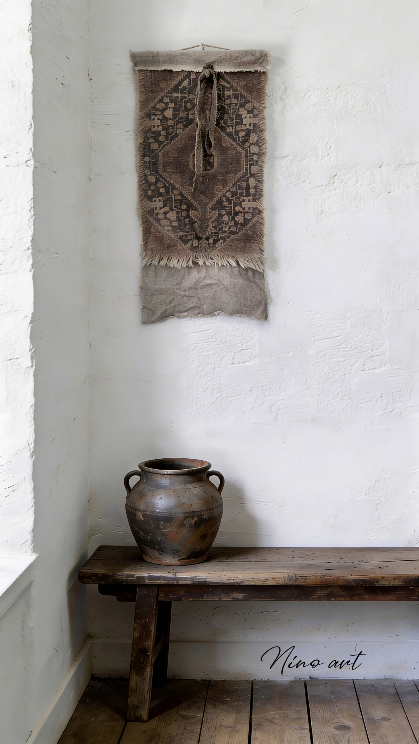 Mini wandhanger in Kelim stijl, door ons met grote zorg vervaagd bedrukt, zodat de vlas linnen stof met de inkt een perfecte combi is geworden.